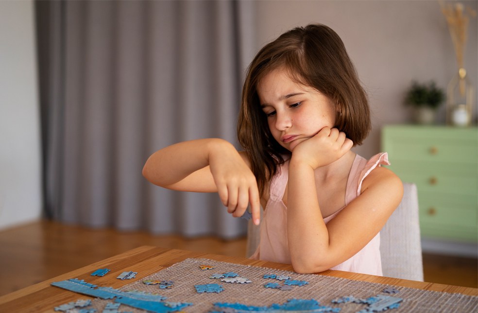 A girl playing alone with puzzles