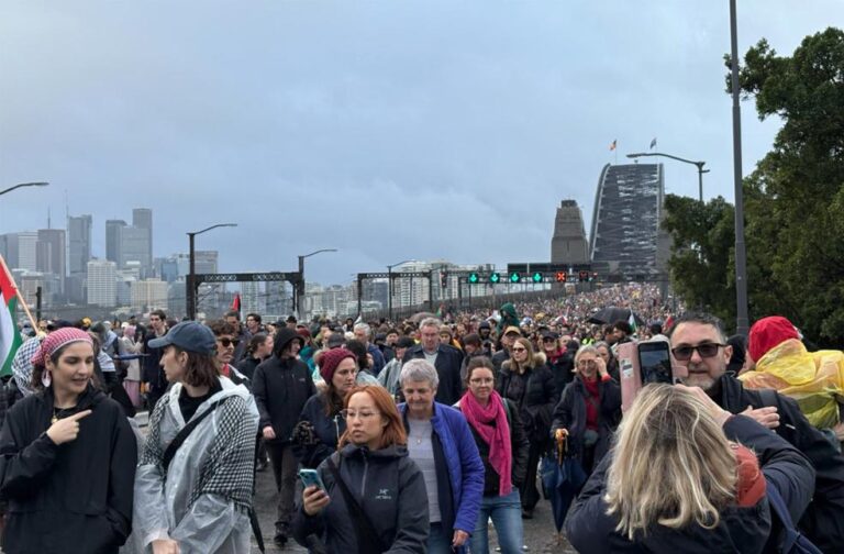 Sydney: Tens of thousands of demonstrators braved pouring rain on August 3 to join the ‘March for Humanity’ across Sydney’s iconic Harbour Bridge, demanding peace and urgent aid deliveries for Gaza.