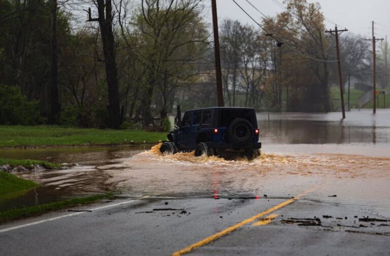 Jeep navigating through flooded roadway during Storm Leonardo